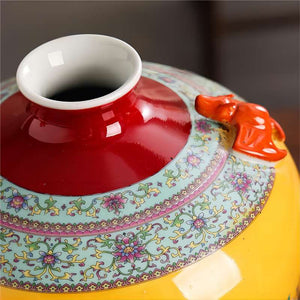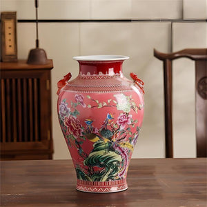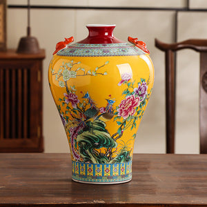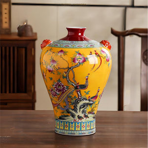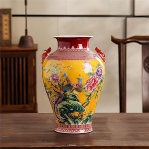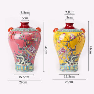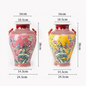 These beautiful Chinese-style vases are a stunning addition to any home. The bright yellow and pink glazes are eye-catching and the intricate flower-and-bird designs are sure to bring a touch of elegance to any room.