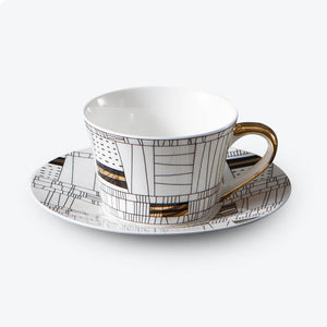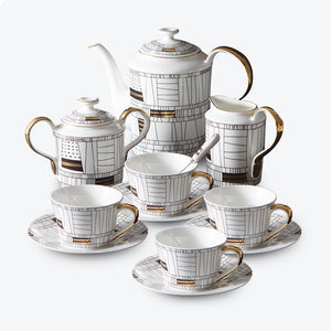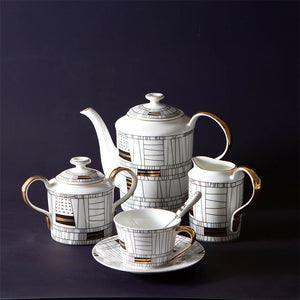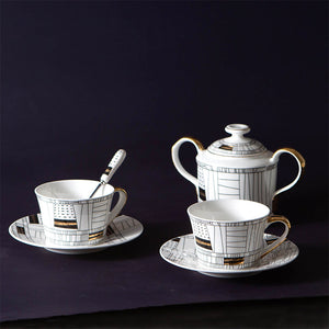 Crafted from premium bone china, this Architecture Tea Set with Gold Trim redefines sophistication through its bold geometric design. The collection includes a large teapot, small teapot, milk jug, sugar bowl, four teacups, and matching saucers, each adorned with black and gold linear patterns that reflect contemporary minimalism.