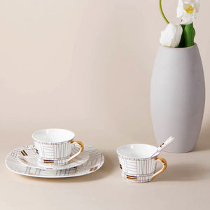 The pristine white base is elevated with 24K gold trim on handles and rims, merging timeless luxury with modern artistry. Featuring ergonomic spouts, curved handles, and a rounded silhouette, each piece ensures comfort and elegance with every pour.