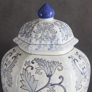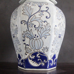 Elevate your home decor with this hand-painted blue and white porcelain ginger jar vase, a timeless masterpiece blending traditional Chinese artistry and modern elegance. Crafted from high-quality porcelain, its hexagonal prism design features a slender body, a matching hexagonal lid with a blue knob, and intricate floral motifs symbolizing prosperity. The classic blue-and-white color scheme — vivid cobalt patterns on a pristine white base — creates striking contrast, embodying the harmony of Yin and Yang in Chinese culture.
