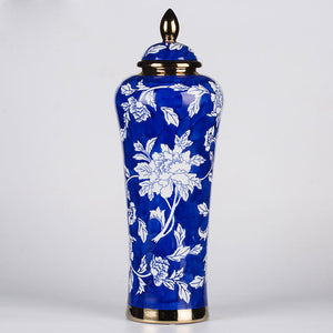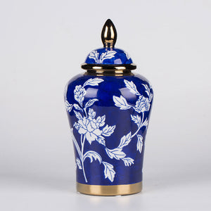 A: A Blue and White Porcelain Ginger Jar is a classic Chinese storage container known for its rounded body, domed lid, and cobalt-blue floral patterns painted on a white porcelain base. Originally used to store tea, spices, or herbs, it now functions as a decorative accent in homes and galleries.