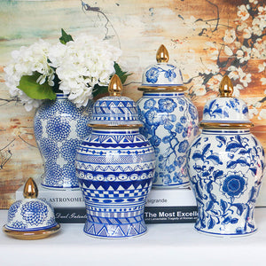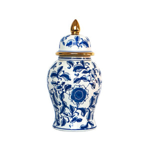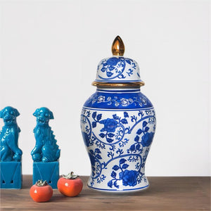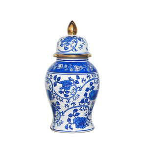 Elevate your home décor with this exquisite Chinoiserie blue and white porcelain ginger jar, a masterpiece blending traditional Chinese artistry and European-inspired design. Crafted from premium porcelain, this slender cylindrical jar features intricate hand-painted cobalt-blue motifs of peonies, lotus flowers, and scrolling foliage against a luminous white glaze. The domed lid, adorned with a golden finial, ensures effortless opening while adding a touch of luxury. A gilded rim seamlessly connects the lid and body, enhancing its refined aesthetic.