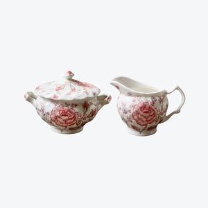 A. The pastel pink floral patterns and romantic design evoke a classic British afternoon tea ambiance, perfect for serving tea, milk, and sugar elegantly.