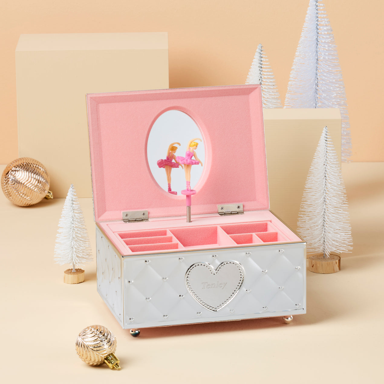 This beautiful jewelry box features a charming outer shell that opens to a soft pink interior with several compartments. With a graceful ballerina that spins in front of the mirror, the Childhood Memories jewelry box is perfect for the aspiring dancer. Plays "Für Elise."