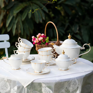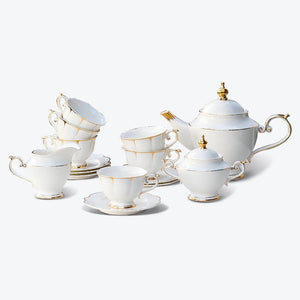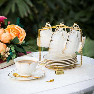 Our ceramic tea set is made of fine porcelain, ensuring the full tea set is more delicate and smooth. With an exquisite colored glaze surface, petal shape, and glittering gold trim, the modern tea set will serve as a unique decoration on the dining table.