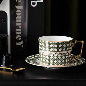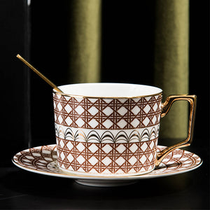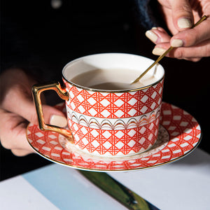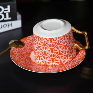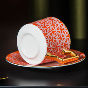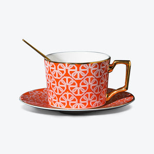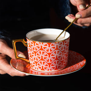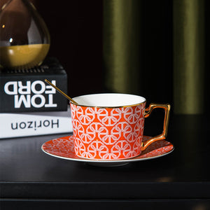 Adorned with bold geometric patterns in crisp white, the vibrant orange-red, earthy brown, or soothing sage green base creates a striking contrast. Luxurious gold accents frame the cup’s rim, handle, and saucer edge, adding a touch of sophistication. The minimalist yet symmetrical motifs cater to contemporary tastes while complementing classic tableware collections.