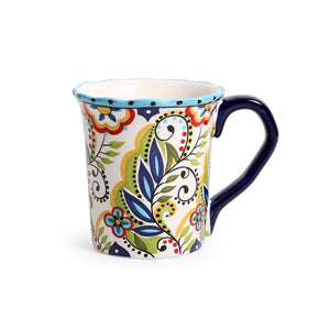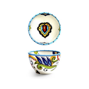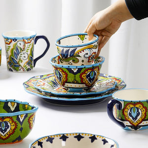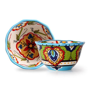 Mediterranean Artistry: Hand-painted floral and geometric patterns in bold blue, green, and red hues.