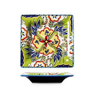 A: The set showcases vibrant colors like blue, green, yellow, and red, with floral and geometric patterns for a lively, artistic look.