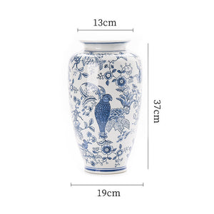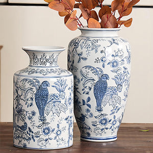 Elevate your space with this exquisite hand-painted parrot blue and white porcelain vase, a masterpiece of traditional Chinese craftsmanship. Featuring a classic dual-vase set (one tall and slim, one short and sturdy), this collection showcases intricate cobalt-blue motifs of parrots soaring among blooming peonies and winding foliage, all set against a pristine white ceramic base.