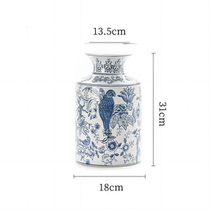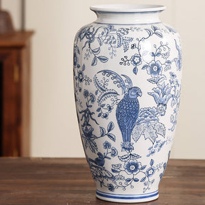 A: These vases often feature a white porcelain base adorned with cobalt-blue motifs such as birds (like parrots), floral patterns, and foliage. The contrast between blue and white creates a classic, timeless look that reflects traditional Chinese aesthetics.
