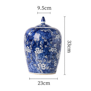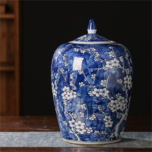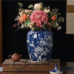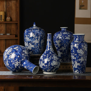 Introducing our exquisite hand-painted plum blossom blue and white porcelain collection, a timeless set of four meticulously crafted ceramic pieces that blend traditional artistry with functional elegance. This collection includes two vases, one lidded jar, and a slender-neck vase, all adorned with delicate plum blossom motifs symbolizing resilience and beauty.