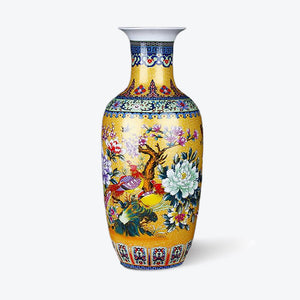 This vase is available in short open-neck. Its shape looks like a Mellon. You can see different things on this vase, like peacock, peony and others, which look unique. All these things consider happiness, wealth & peace.