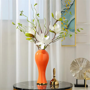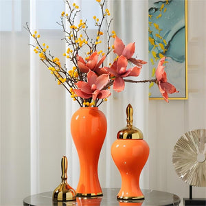 The vase is made of high-quality ceramic, and it is hand-painted with a beautiful orange glaze. The golden edge is also hand-painted, and it is made of a durable gold leaf. The vase is sturdy and well-made, and it is sure to last for many years.