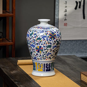 A: These vases capture the essence of classic Chinese porcelain design, incorporating harmonious color tones such as blue, white, red, green, and yellow, along with floral motifs inspired by nature and symbolism.