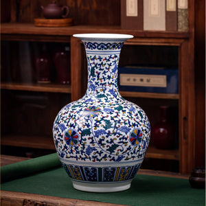 Elevate your home décor with our handmade oversized blue and white ceramic floor vases, inspired by centuries-old Chinese porcelain artistry. Each vase features a sturdy flat base for stability, a slender neck, and a rounded body adorned with intricate blue floral patterns against a white backdrop. Delicate red, green, and yellow accents highlight the traditional Ming and Qing dynasty motifs, while colorful border trims add a vibrant finish. Perfect for modern or classic interiors, these large floor-standing vases double as statement art pieces or functional containers for floral arrangements. Crafted from premium ceramic and sealed with a glossy glaze, they are easy to clean with a soft cloth—ideal for living rooms, lobbies, or office spaces seeking bold, cultural elegance.