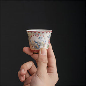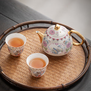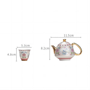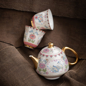 Applying a unique Chinese thread-weaving enamel process and a high-ended golden gilt handle, this tea set is beautifully decorated with a harmonious pink peony and blue magpie design. A delicate wave pattern background adds to the traditional appeal. A gorgeous gift for weddings and birthdays.