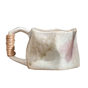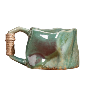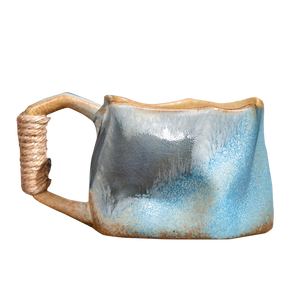 Each mug is carefully handmade and kiln-fired, creating unique textures and natural curves. The slightly crinkled form gives it an artistic flair, while the rope-wrapped handle ensures a comfortable, anti-slip grip.