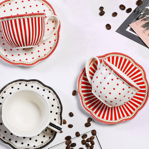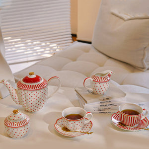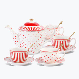 Complementing the teapot are 4 teacups with matching saucers: two cups showcase bold red polka dots, while the other two display chic vertical red stripes – all accentuated by gold-trimmed rims. Each cup rests on a white saucer echoing its unique pattern (dots or stripes), with select cups including miniature golden spoons for added functionality.